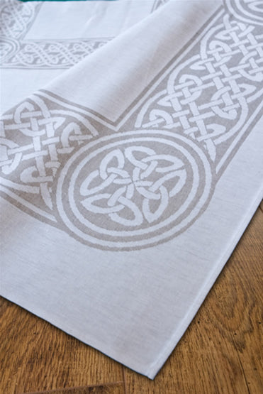 Add timeless elegance to your dining experience with our Irish Linen Damask Colmcille Tablecloth in natural. Crafted from luxurious Irish linen, this tablecloth features a beautifully woven damask pattern inspired by traditional Celtic designs, offering both sophistication and heritage to your table setting. The subtle, natural hue complements any décor, making it perfect for both formal occasions and everyday dining.