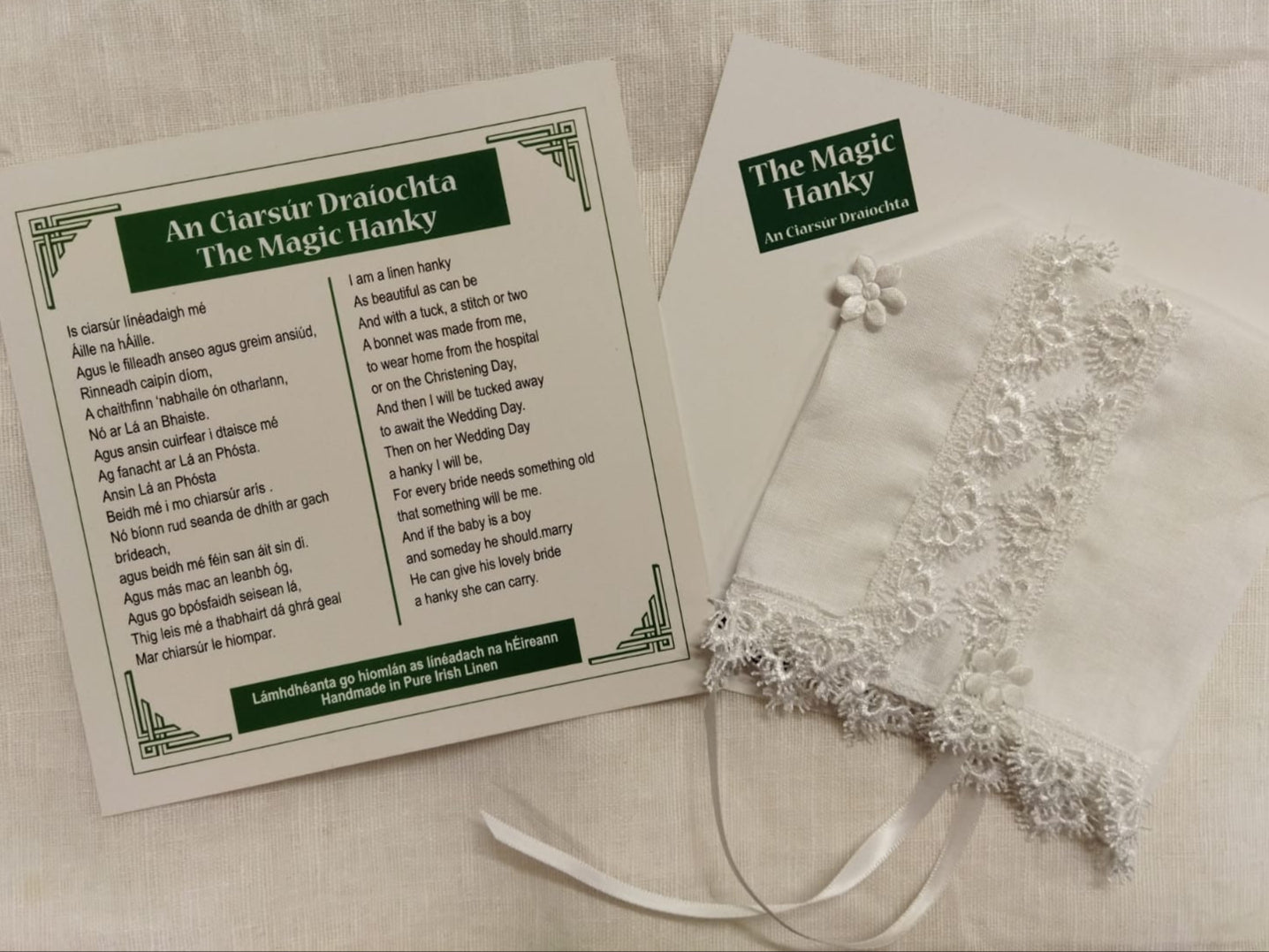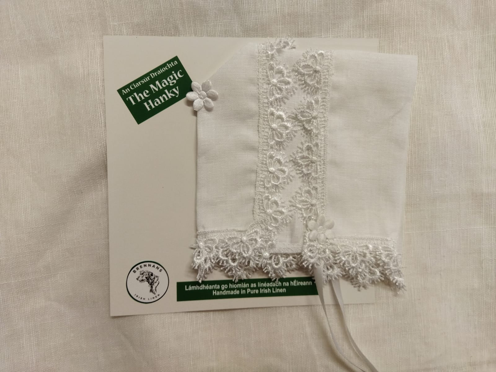 Crafted from authentic Irish linen, this Magic Hanky is more than just a handkerchief. It's a keepsake rooted in heritage. Traditionally given at a Christening as a baby bonnet, it’s later passed down as a “something old” for a wedding day.